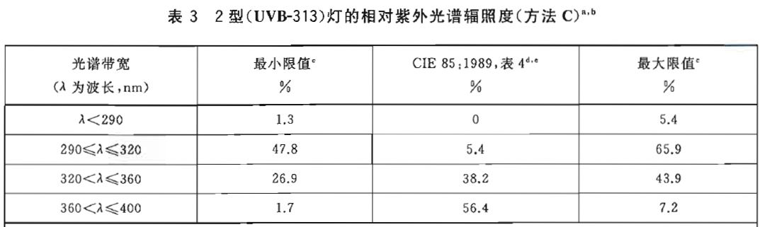a 本表給出了在給定帶寬內的輻照度占250nm~400nm總輻照度的百分比,要檢測一個典型的2型(UVB-313)燈是否符合本表要求,應測量250nm~400nm的光譜輻照度。然后將每一帶寬內的總輻照度加和,再除以250nm~400nm間的總輻照度。