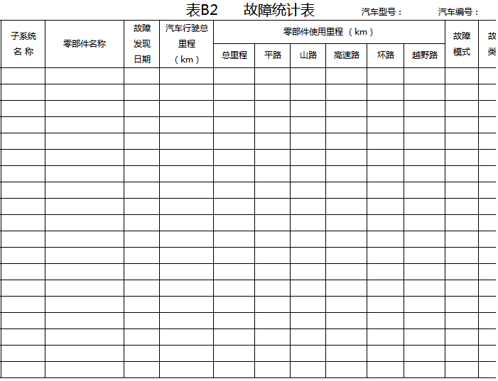 9.2 可靠性行駛試驗(yàn)期間,對(duì)所有故障做詳細(xì)記錄,包括故障里程、模式、排除措施及故障停車時(shí)間、排除故障工時(shí)。
